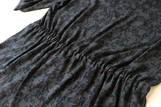 Comme pour mes précédentes versions, j’ai élastiqué la taille : les fronces sont ainsi plus harmonieusement réparties que si j’avais juste mis une ceinture.