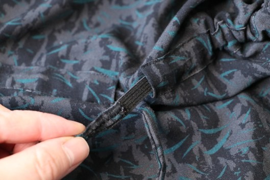 Pour cette version, j’ai cousu une coulisse que j’ai plaquée sur l’endroit du tissu et dans laquelle passe un élastique et au bout duquel j’ai cousu des liens dans le même tissu.