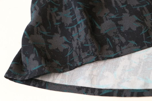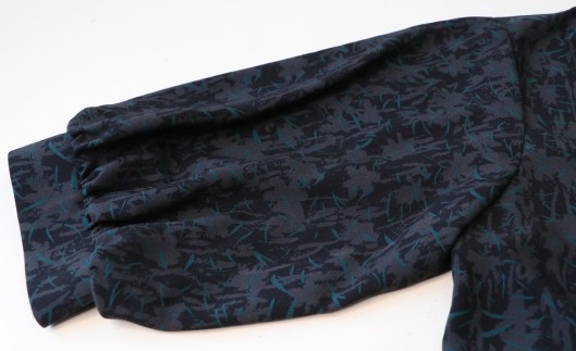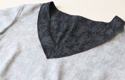 L’envers de cette viscose est très contrastant par rapport à l’endroit. J’ai donc utilisé du fil noir pour finir les bords des coutures ouvertes. Idem pour finir les parementures. J’ai utilisé du fil gris pour surfiler les manches aux emmanchures. C’est ainsi plus esthétique visuellement (c’est un détail, j’en conviens !) :