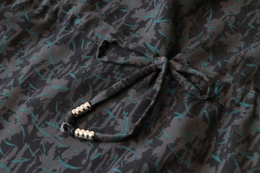 Pour cette version, j’ai cousu une coulisse que j’ai plaquée sur l’endroit du tissu et dans laquelle passe un élastique et au bout duquel j’ai cousu des liens dans le même tissu.