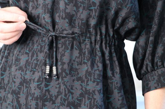 Comme pour mes précédentes versions, j’ai élastiqué la taille : les fronces sont ainsi plus harmonieusement réparties que si j’avais juste mis une ceinture.