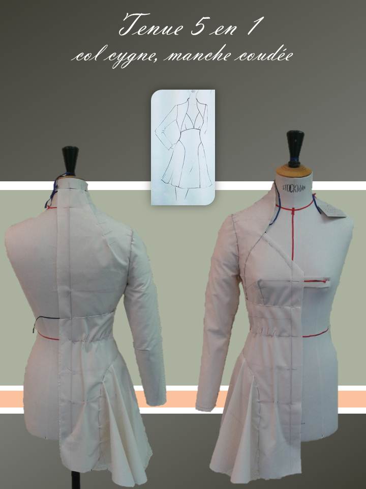 Les difficultés de cette tenue ont été le moulage du col montant (col cygne), la robe sans pince à la taille, les godets de la partie évasée de la jupe et la manche coudée.