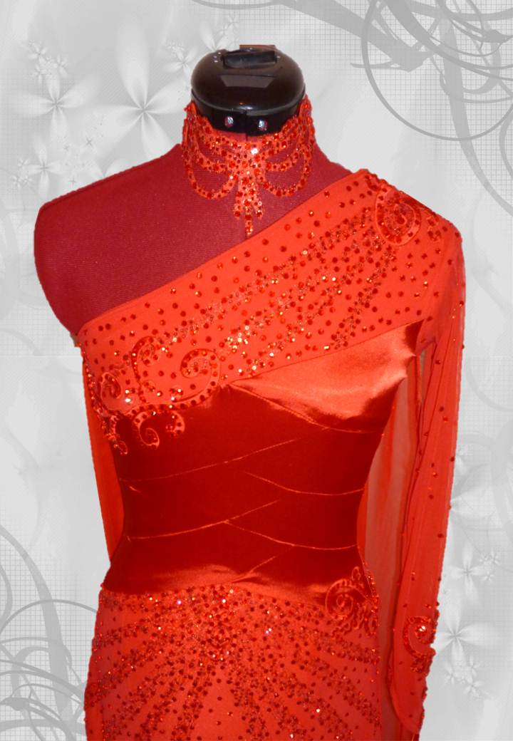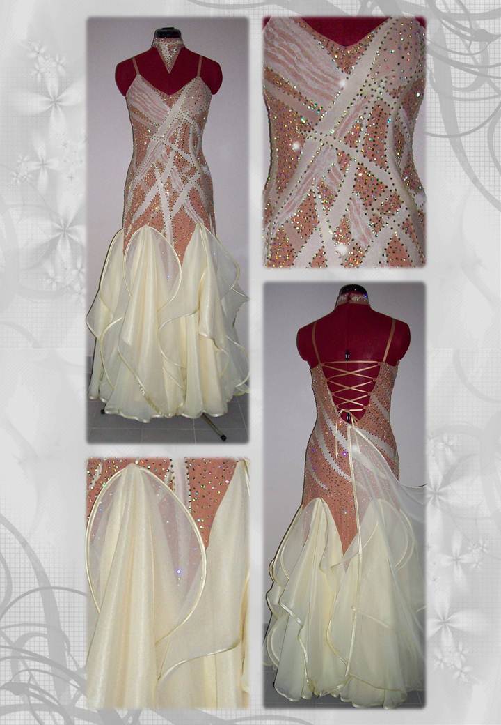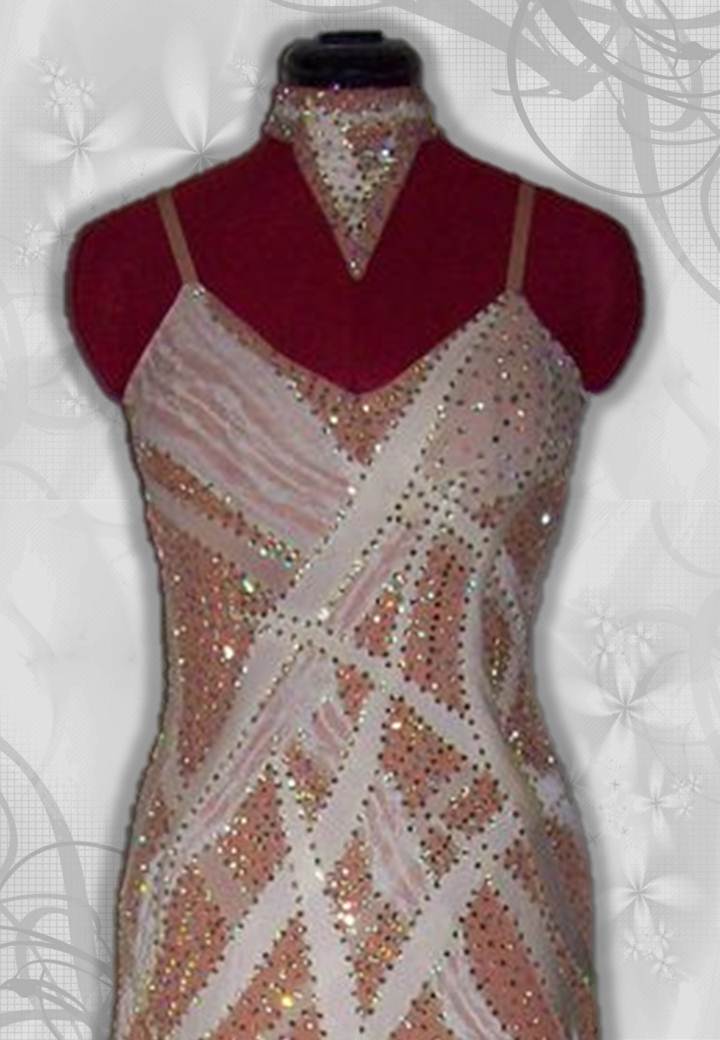 Ma première robe de danse créée par moi ! Lycra, mousseline et satin. Robe en deux parties (haut et jupe). Body incorporé. Gants, collier et boucles d’oreilles. Strass Swarovski.
